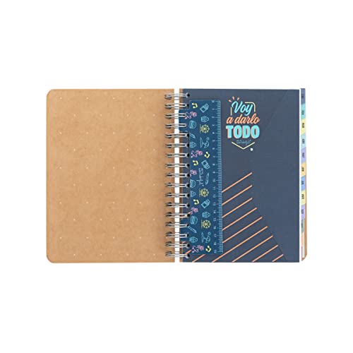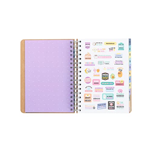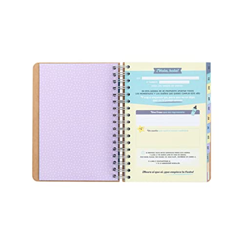 - Esta agenda contiene: 368 páginas Papel de 80 gr Frases diarias motivacionales Separadores con pestaña para cada mes Bolsillo interior de cartón Regla de plástico interior 8 hojas de pegatinas Juegos y extras entretenidísimos Horarios Calendarios Página para anotar contactos Tablas de ahorro Cierre con goma elástica Planificador mensual al inicio de cada mes Blocs de notas adhesivas con formas Frases mensuales superdivertidas