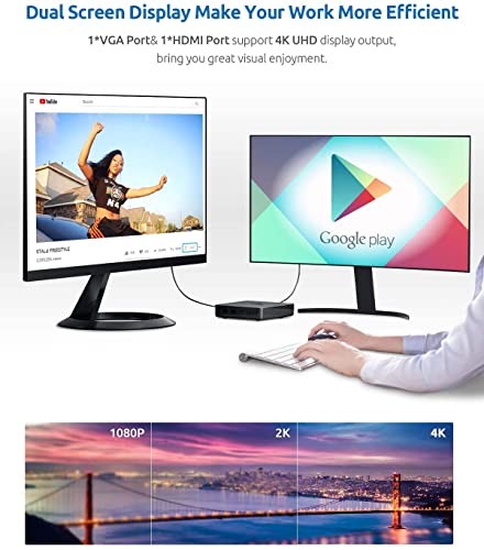 - 【Pantalla triple 4K HD】 Esta pequeña computadora de PC admite pantalla doble o triple a través de 2 * puertos HDMI y 1 * puertos VGA, mejorando la eficiencia del trabajo. 4K HD Graphics le ofrece una experiencia de visualización de primera clase con una calidad de imagen realista que se puede utilizar como centro multimedia para programas de televisión.