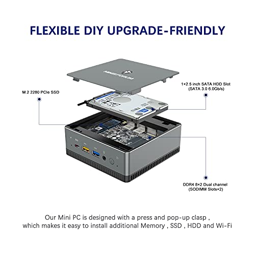 - 【Memoria grande y expandible】 Esta mini PC de escritorio está equipada con 8 GB DDR4 y 256 GB SSD que tiene suficiente memoria para ejecutar y almacenar más archivos y películas. También puede expandirla con USB externo o SATA HDD / SSD de 2.5 pulgadas o M.2 NVME SSD para expandir el almacenamiento.