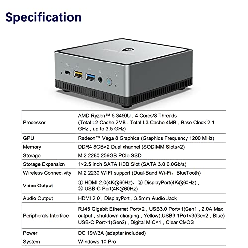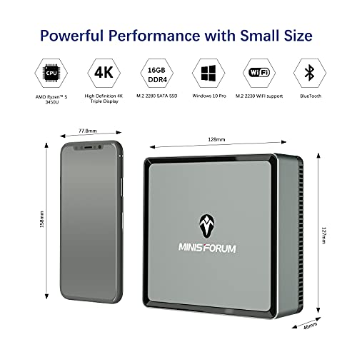 MINIS FORUM Mini PC AMD Ryzen 5 3450U 4 núcleos/8 Hilos| 16 GB RAM 256 GB PCIe SSD| Gráficos Radeon Vega 8| Bluetooth Wi-Fi de Doble Banda| 4K HDMI/DP/USB-C| 2X RJ45| 4 Puertos USB 3.0