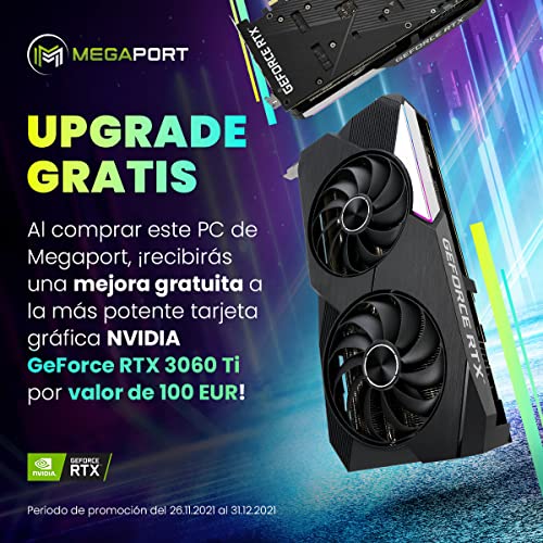 - Con más de 15 años de experiencia y socios premium de renombre a nuestro lado, equipamos nuestros PC con el hardware más reciente y de mayor calidad para ofrecerte las mejores condiciones para tu experiencia de juego. Al comprar este PC de Megaport, ¡recibirás una mejora gratuita a la más potente tarjeta gráfica Nvidia GeForce RTX3060Ti por valor de 100 euros! (Periodo de promoción del 26.11.2021 al 31.12.2021)