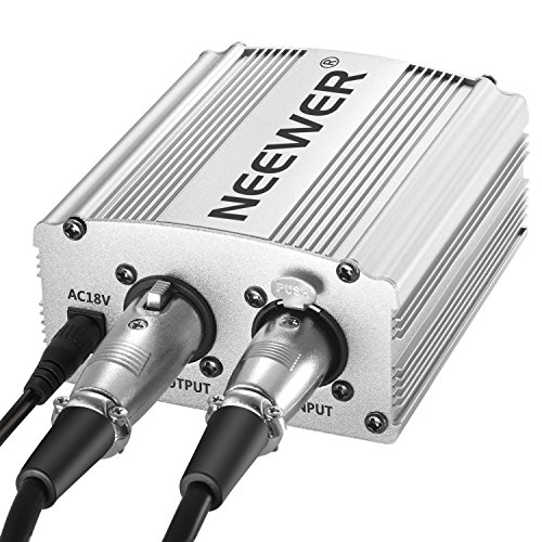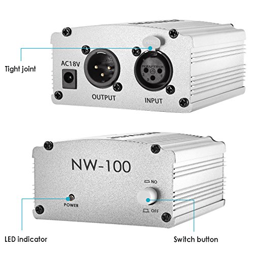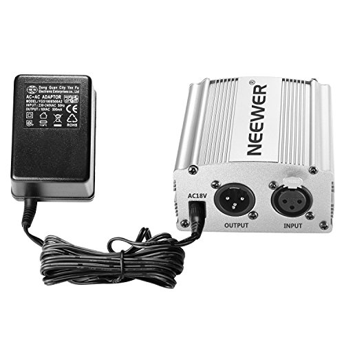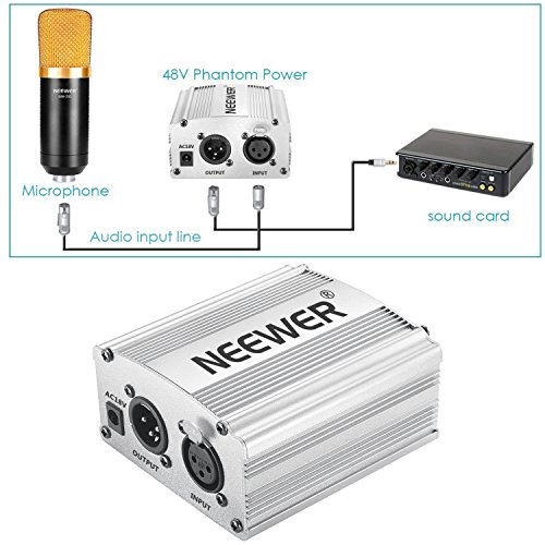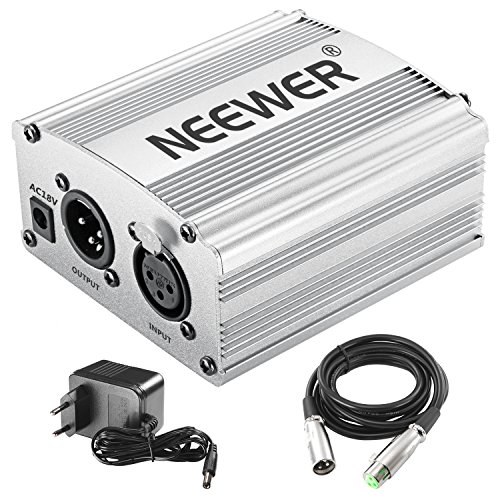Neewer 1 Canal 48 V Phantom Fuente de alimentación de Color Plateado con Adaptador y Cable de Audio XLR para Cualquier micrófono de Condensador para música y Estudio de grabación