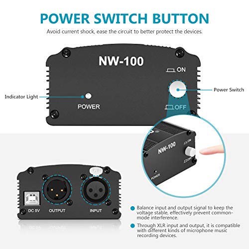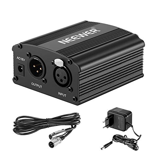 Neewer 1-Canal Phantom 48V Alimentación Suplimiento Negro con Adaptador y Cable de Audio XLR para Caulquier Micrófono Condensador Músico Equipo de Grabación