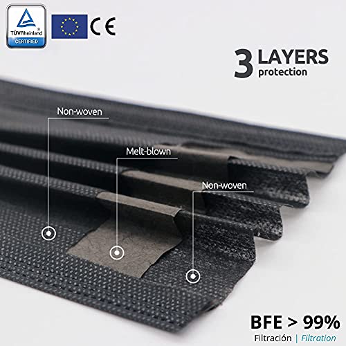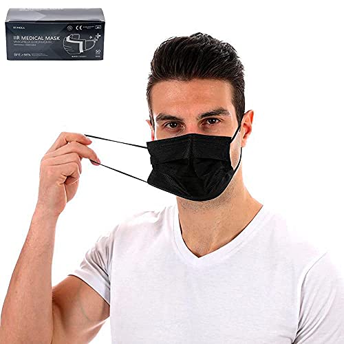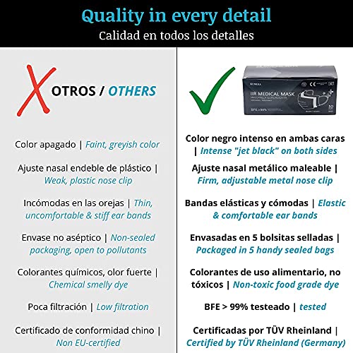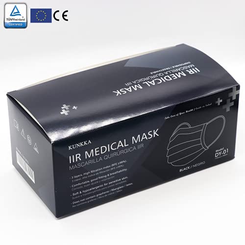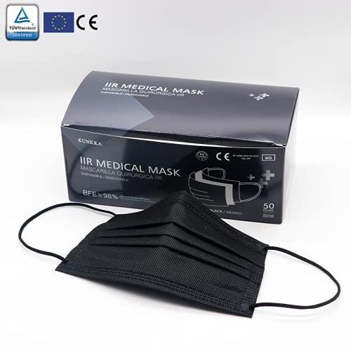 50 uds Mascarillas Negras Quirúrgica IIR | Homologada CE, certificada | 3 capas (BFE>99%), uso Médico, desechable - no Reutilizable, tamaño Adulto, envío desde España, color Negro