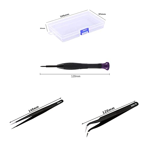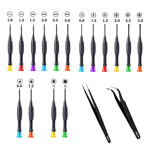 - Contenido del envío: 2 destornilladores Torx: T5 T6; 2 destornilladores de estrella: 0,8 mm, 1,2 mm; 6 destornilladores planos: 1,0 mm, 1,2 mm, 1,5 mm, 2,0 mm, 2,4 mm, 3,0 mm; 6 destornilladores de estrella: 0,8 mm, 1,2 mm, 1,5 mm, 2,0 mm. .5 mm, 3.0 0 mm; 2 pinzas: ESD11, ESD15. El juego de destornilladores de precisión se coloca en una caja transparente para mantenerlos limpios, organizados y fáciles de encontrar.