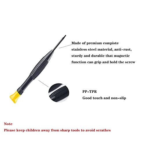 - Amplia aplicación: los destornilladores cubren una amplia gama de trabajos y reparaciones en nuestra vida diaria. Se puede utilizar para gafas, gafas de sol, joyas, juguetes, cámara, ordenador portátil, PC, disco duro, herramientas de relojería, óptica de ojos, reparación de gafas de sol, reloj y estos pequeños dispositivos electrónicos con tornillos pequeños.