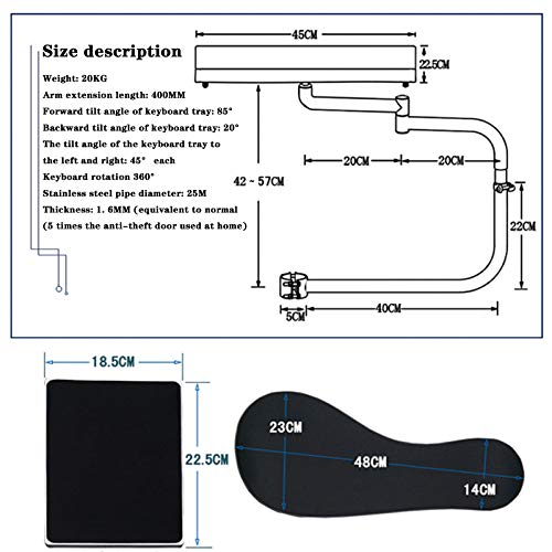- Características del producto Introducción: Capacidad de carga: 20 KG, Longitud de extensión del brazo: 400 MM, Ángulo de inclinación hacia adelante de la bandeja del teclado: 85 ° Ángulo de inclinación hacia atrás de la bandeja del teclado: 20 °, Inclinación de la bandeja del teclado Ángulo de izquierda a derecha: 45 ° cada uno, Rotación del teclado 360 ° Acero inoxidable Diámetro de la tubería: 25 mm, espesor: 1,6 mm equivalente a 5 veces la puerta antirrobo utilizada en hogares comunes.