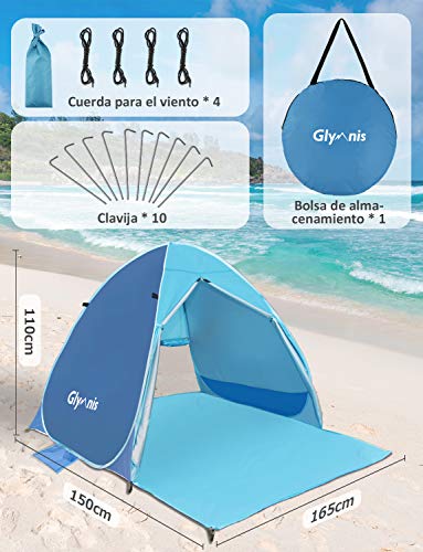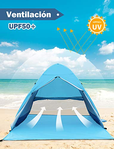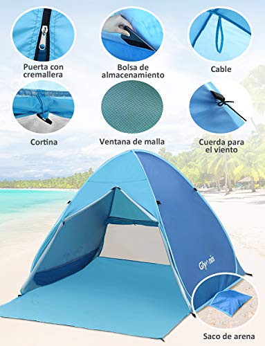 Glymnis Tienda de Playa Pop Up 2-3 Personas Anti-UV Protección Solar Tienda Instantánea Automática UPF 50+ Tienda de Playa Portátil con Puerta Cremallera para Playa Parque Pescar Patio Azul