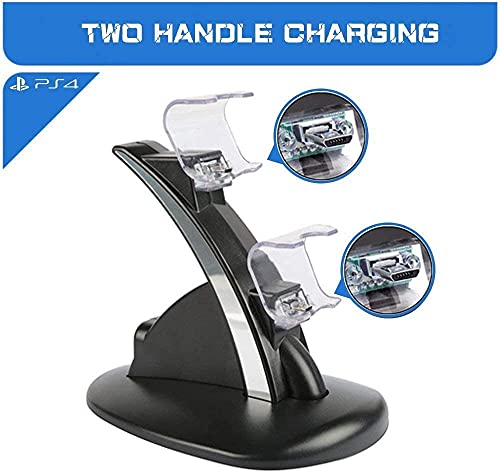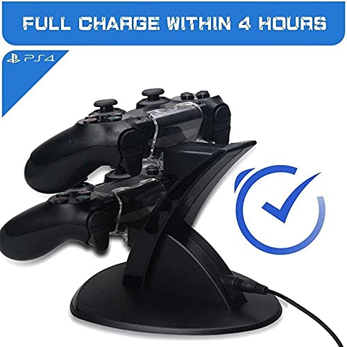 - ??Soporte de carga DualShock: puede almacenar y cargar de forma segura dos controladores PS4 al mismo tiempo dentro de 2 a 4 horas. El soporte tiene 2 ranuras micro USB. Después de enchufar la fuente de alimentación, el controlador se cargará inmediatamente. Cuando lo use de nuevo, no tendrá que preocuparse por quedarse sin batería