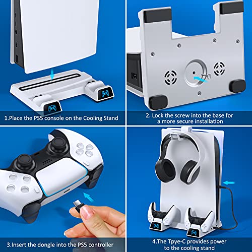 - 【Soporte para Playstation 5 con dos ventiladores】 El soporte para PS5 con ventiladores de enfriamiento eficientes, estación de carga del mando PS5, soporte para auriculares, 15 memorias para juegos PS5, tres puertos de carga USB adicionales y tornillo es multifuncional. Esta estación de enfriamiento PS5 puede cargar rápidamente dos PS5 Dual Sense al mismo tiempo y disipar el calor para la consola Playstation 5.
