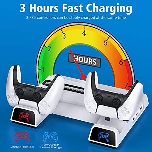 - Carga de alta velocidad e indicadores LED transparentes: utiliza la estación de carga Playstation 5 para recargar controladores duales PS5 en menos de 2 1/2 horas simultáneamente. Cuenta con 2 indicadores de carga LED que muestran el estado de carga: la luz roja está cargando, la luz verde está completamente cargada/en espera.