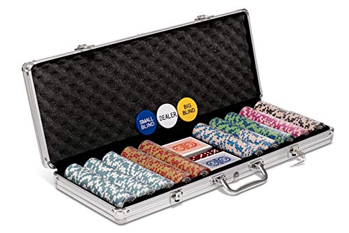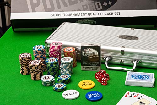 Poker Night Pro Juego de 500 fichas de Texas Holdem Poker con un Gran Estuche de Aluminio Fichas numeradas 14g, 2 Barajas de Cartas Profesionales de plástico, Botones y 5 Dados