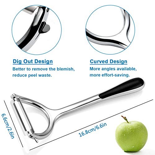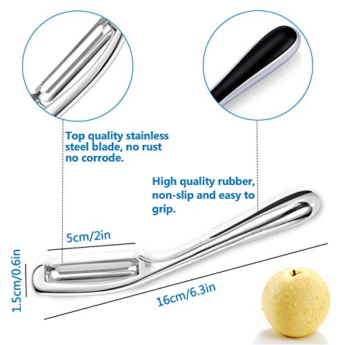 - ? 【Nuestros productos incluyen】 1 pelador giratorio en forma de Y de 16,8 cm y 1 pelador de verduras recto de 16 cm. La longitud de dos cuchillas es de 5 cm, adecuada para la mayoría de verduras y frutas. ¡Perfecto tanto para la mano derecha como para la izquierda!