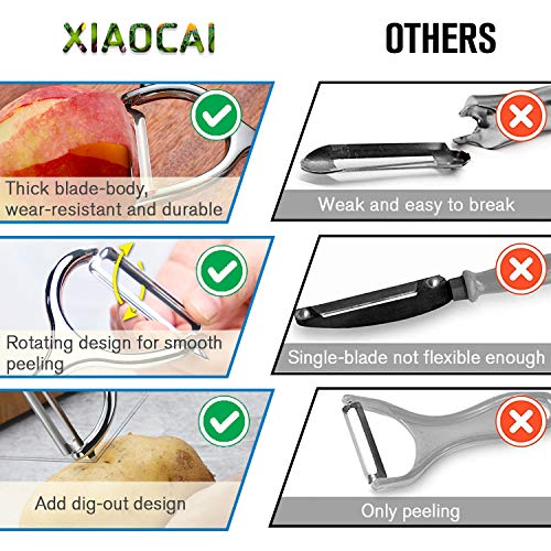 - ? 【Ayudante de cocina】 Nuestro pelador multiusos también incorpora una función práctica para eliminar imperfecciones. Funciona perfectamente en verduras y frutas como patatas, zanahorias, manzanas, peras, kiwis, tomates, limones, remolachas, raíces de perejil, pepinos, batatas, calabacines, etc.