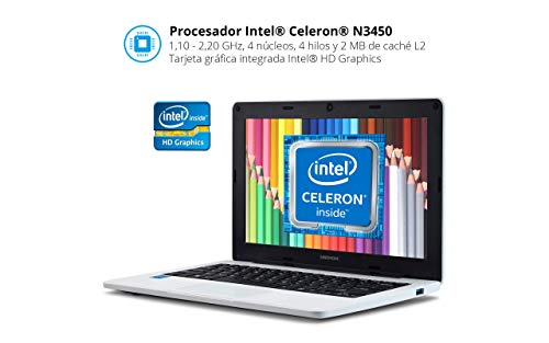 - Procesador Intel Celeron N3450 QC (4 núcleos, 2 MB L2 Cache, 1.10 GHz hasta 2.20 GHz).