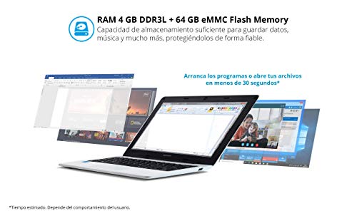 - Procesador Intel Celeron N3350 (2 nucleos, 2 MB Cache, 1.1 GHz hasta 2.4 GHz)