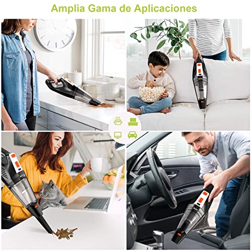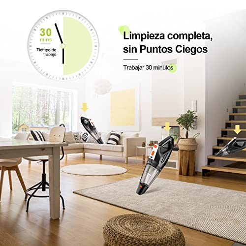 - ?【Batería Larga Duración y Carga Rápida】Esta aspiradora de mano potente sin la molestia de los cables y fácil de limpiar en todas las áreas. La batería es muy práctica capacidad de 2600 mAh, solo 3 horas en cargar completamente y pueden funcionar durante 25-30 minutos. Se puede limpiar libremente la casa de una habitación a otra. Con su peso ligero, es muy fácil de usar para que usuarios de todas las edades completen la limpieza.