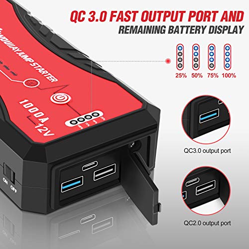 - ? QC 3.0 carga rápida: Este arrancador de coche tiene 2 salidas USB (una es QC 3.0), le permite cargar 2 dispositivos a la vez, como computadoras portátiles, teléfonos inteligentes, tabletas, cámaras, etc