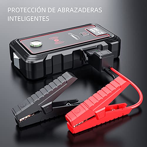 - ?【Cómoda carga inalámbrica】Si olvida llevar un cable de carga, este arrancador de coches es su mejor opción, soporta 10 W de carga a dispositivo inalámbrico con capacidad de carga (dispositivos Qi inalámbricos). Este arrancador de coche soporta carga rápida de entrada, siendo compatible con qualcomm QC 3.0, por lo que puede cargar smartphones, cámaras, kindle y otros dispositivos con USB A y USB C.