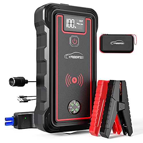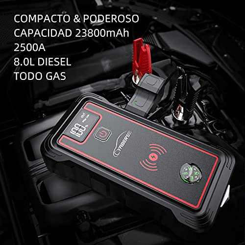 YABER Arrancador de Coches, 23800mAh 2500A Arrancador de Baterias de Coche (para Todo vehículo de Gasolina o 8.0L de Diesel), con Cargador Inalámbrico y Linterna LED, Brújula,Martillo de Seguridad