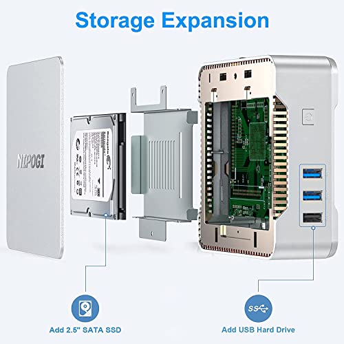 - 【Memoria grande y expandible】 Esta mini PC de escritorio está equipada con 8 GB DDR4 y 256 GB SSD que tiene suficiente memoria para ejecutar y almacenar más archivos y películas. También puede expandirla con USB externo o SATA HDD / SSD de 2.5 pulgadas o M.2 NVME SSD para expandir el almacenamiento.