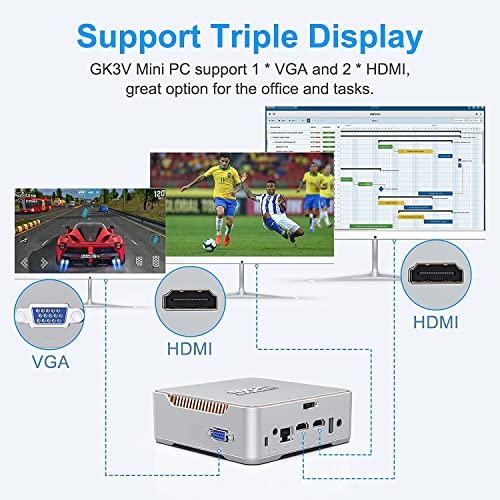 - 【Pantalla triple 4K HD】 Esta pequeña computadora de PC admite pantalla doble o triple a través de 2 * puertos HDMI y 1 * puertos VGA, mejorando la eficiencia del trabajo. 4K HD Graphics le ofrece una experiencia de visualización de primera clase con una calidad de imagen realista que se puede utilizar como centro multimedia para programas de televisión.