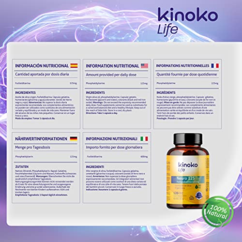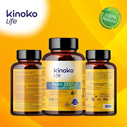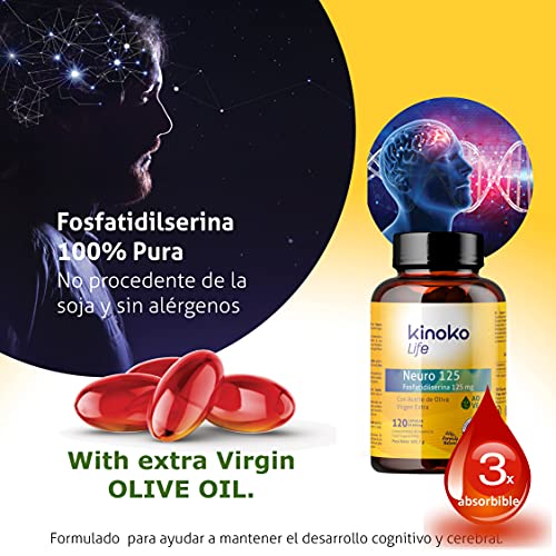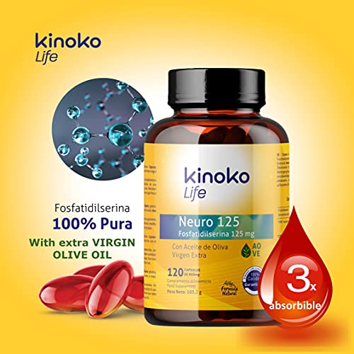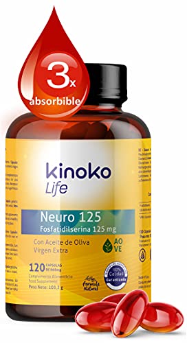 - ★ MÁXIMA BIODISPONIBILIDAD: Ofrecemos la mayor pureza en la composición de Kinoko life Neuro 125 Fosfatisilserina 125mg Pura en formato de softgels con aceite de olive extra virgen, Con esto se consigue máxima absorción por nuestro organismo, para ayudar a la función cognitiva y cerebral, ya que los niveles de fosfatidilserina disminuyen naturalmente con la edad.