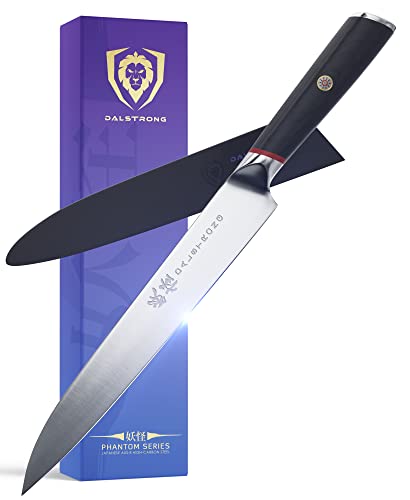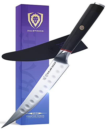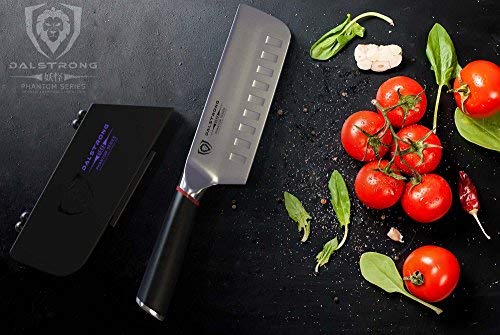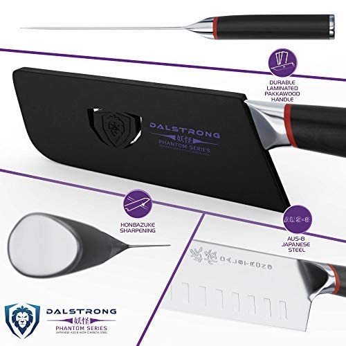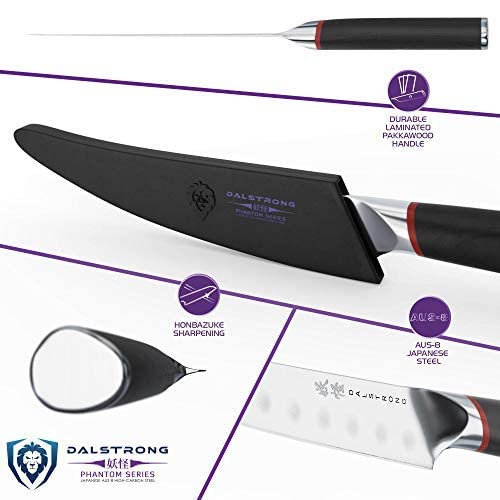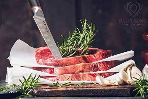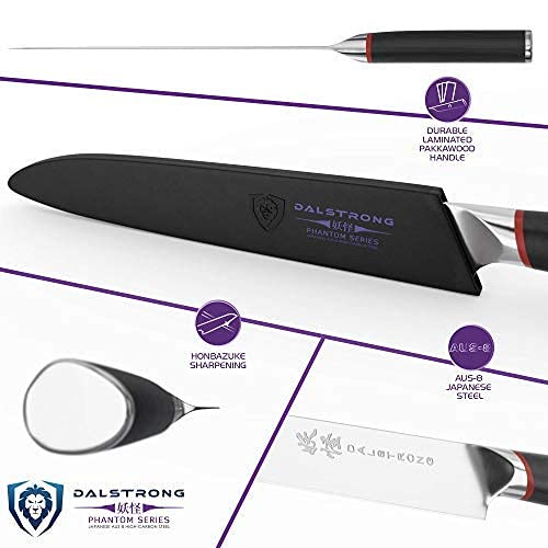 - The Dalstrong Touch: Full tang and precision forged from a single piece of ice tempered, high-carbon, Japanese AUS-8 steel at 58+ Rockwell hardness, the Phantom Series boasts exceptional sharpness, edge retention, strength and durability. Beautifully engraved, the blade further features a hand polished spine and ergonomic bolster shape for a natural and smooth ‘pinch grip’.