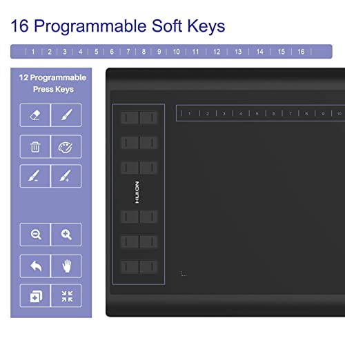 - ?12 teclas rápidas y 16 teclas suaves: las 12 teclas rápidas físicas a la izquierda y las 16 teclas suaves en la parte superior de la superficie de dibujo son todas personalizables, lo que le brinda una gran cantidad de formas de personalizar su experiencia de software y aumentar la eficiencia de su trabajo .