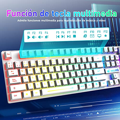 - 【Teclado mecánico de 87 teclas para juegos】 TODOS los teclados mecánicos para juegos de 87 están libres de conflictos (n-key rollver) para un rendimiento de juego máximo. Con 12 botones multimedia, ergonómico antideslizante, diseño a prueba de salpicaduras con patas traseras ajustables para un ángulo de escritura perfecto, cable USB de alta velocidad con conexión USB chapada en oro y libre de corrosión para una conexión confiable que puede soportar juegos rápidos rápidos