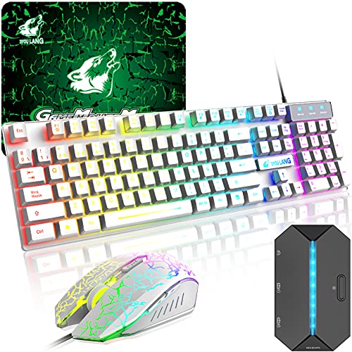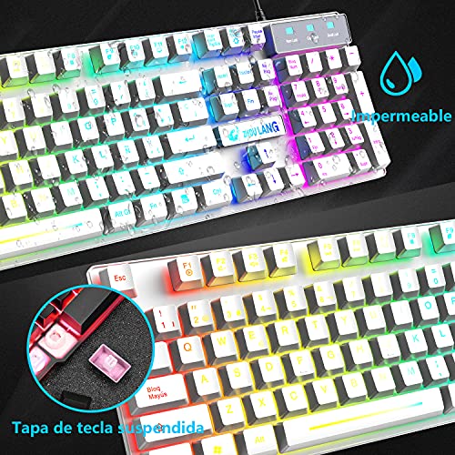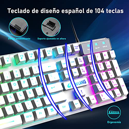 RGB Teclado y Ratón Gaming Español con Adaptador, Teclados QWERTY Retroiluminado con Arcoiris, Raton de 2400 dpi, Alfombrilla de Ratón, Cable USB, Compatible con Windows Mac PS4 Xbox Switch, Blanco®