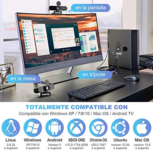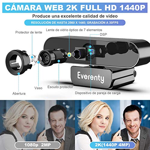 - 【Cámara web USB Full HD 2K 4MP 1440P】 Cámara USB Everenty Con tecnología CMOS 1440p Full HD de 4 megapíxeles, Resolución panorámica de alta definición de 2560 × 1440P, viene con lente HD de vidrio de 7 capas y sensor de imagen CMOS de 1 / 2.8‘’, es capaz de imágenes claras y calidad de video de alta definición a 30 fps. le permite ver claramente incluso en entornos con poca luz o luz de fondo. Cámara web para PC especialmente diseñada para video chat o grabación de video de calidad profesional.