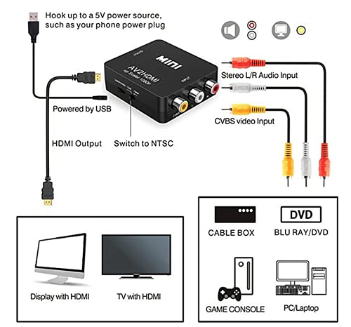 - ➤ 【RCA zu HDMI Konverter】 RCA zu HDMI Video Audio Konverter, Wandelt den analogen Composite Eingang in einen HDMI 1080P Ausgang (60Hz) um. Video und Audioausgabe gleichzeitig. Bieten Sie ein fantastisches Heimkinoerlebnis.