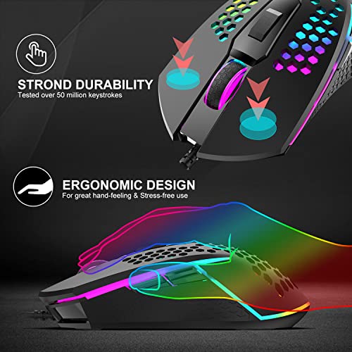 - 【Ratón para juegos LED ultraligero de 65 g】 La superficie del mouse está moldeada en forma de panal para reducir el peso a unos sorprendentes 95 g, lo que significa que no se sentirá incómodo después de un uso prolongado. Y el diseño de la carcasa en forma de panal puede aumentar la disipación del calor y reducir la sudoración. 7 colores de iluminación increíble pueden satisfacer sus diferentes necesidades de retroiluminación del mouse.