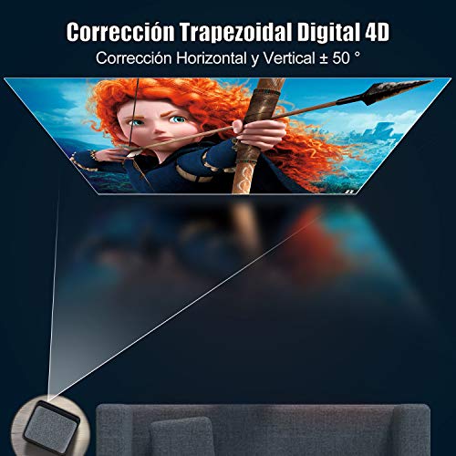 - ?【Ajuste Digital Avanzada de 4-Puntos y Función Zoom Digital】Corrección trapezoidal de las cuatro esquinas de alta sensibilidad (vertical y horizontal ±50°) La actualización del 2020 garantiza una imagen clara en cualquier ángulo y le brinda una gama completa de alta definición. Puede disfrutar de una película en pantalla gigante de 50'' hasta 300'' con una distancia de proyección de 1,5 a 7m. Además, la opción Zoom Digital le permite reducir el tamaño de la imagen del 100% al 50%.