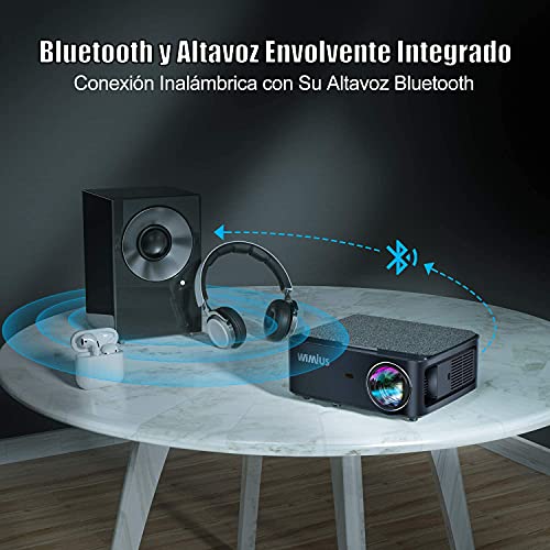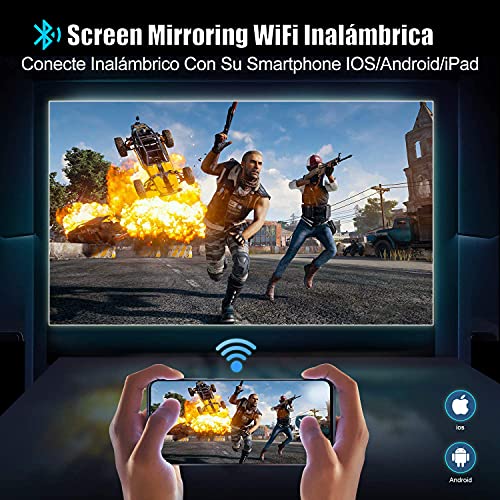 - ?【Conexión 5G WiFi Duplicar Pantalla y Función Bluetooth 5.0】Este proyector wifi Full HD 1080P tiene una función para duplicar la pantalla de forma inalámbrica que le permite conectarse a un teléfono IOS/Android/Tableta. Función de extensión de salida de audio Bluetooth 5.0, Compatible con altavoces/auriculares bluetooth y airpods, y el altavoz integrado de 10W de diseño personalizado ofrece un sonido envolvente estéreo HiFi de 360° sin precedentes para una espacialización sorprendente.