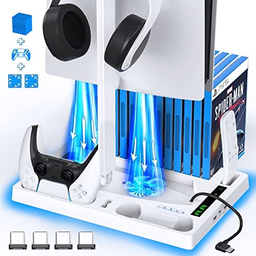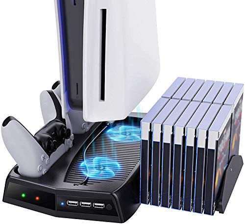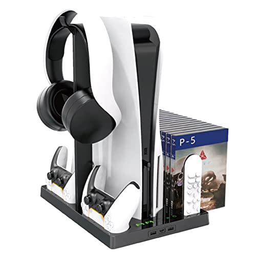 - Fbewan Soporte vertical todo en uno: enfriar y almacenar su consola PS 5, con la estación de cargador de doble controlador y 14 ranuras de juego. El soporte vertical le permite colocar su consola verticalmente, mantiene a sus controladores cargados, enfríe su PS5, almacena juegos, manteniendo todo lo limpio y ordenado. (Controladores y consola no incluidos).