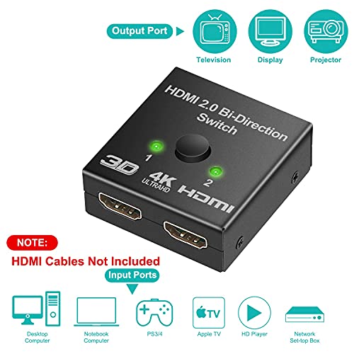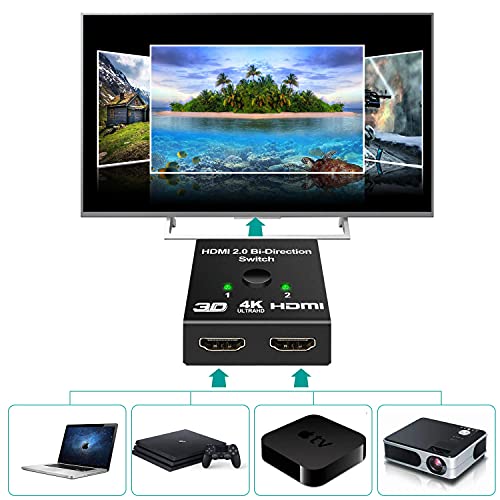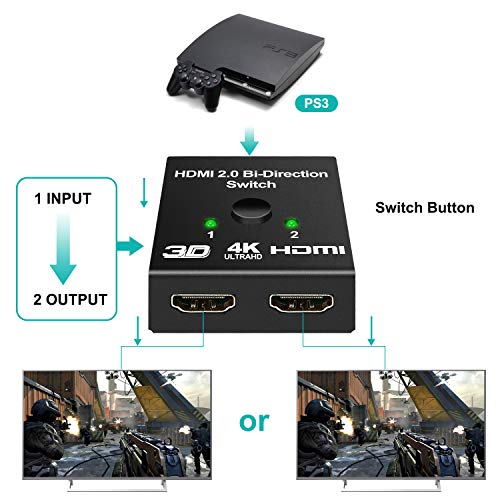 - 【Interruptor HDMI BIDIRECCIONAL】El conmutador HDMI conecta 2 entradas HDMI a 1 pantalla HDMI o conecta 1 fuente HDMI a 2 pantallas HDMI (Nota: 2 pantallas no se pueden mostrar al mismo tiempo)