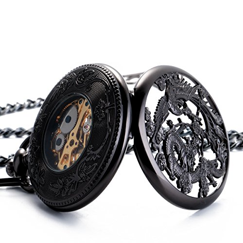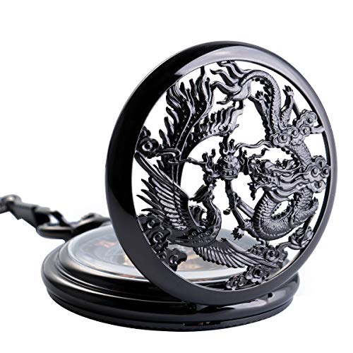 ManChDa Antiguo Negro Hunter Números Romanos Dragon y Phoenix/Reno Patrón Hueco Mecánico Reloj de Bolsillo + Caja de Regalo (1.Black, HBH065)