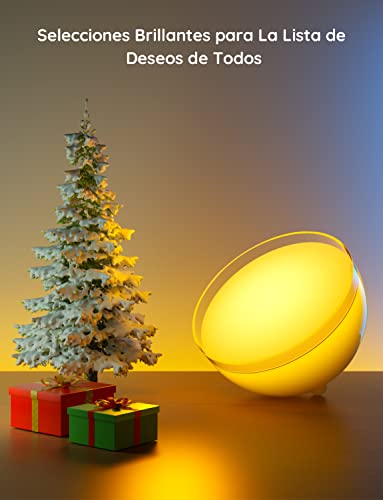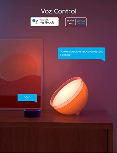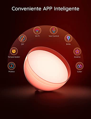 - Fácil Control por Voz con Alexa y Google Assistant: puedes encender y apagar tu lámpara de mesa LED con simples comandos de voz, cambiar los colores, ajustar el brillo y disfrutar de efectos dinámicos.