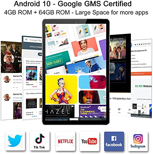 - ♥ Sistema y procesador ♥ La mejor tableta Android de 10.1 pulgadas, ultradelgada y de alto rendimiento, equipada con el último sistema operativo Android 10.0. La verdadera certificación GOOGLE GMS se proporcionará de forma gratuita en la tienda GOOGLE para descargar fácilmente cualquier aplicación, como YouTube, Facebook, WhatsApp, ZOOM, Skype, Netflix, música, juegos.