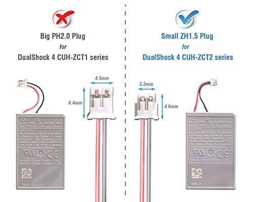 - [Qué enchufe] - los controladores inalámbricos PlayStation 4 vienen con las mismas baterías LIP1522, sin embargo, los conectores son diferentes: ❌grande PH2.0 o ✅pequeño ZH1.5. Este pequeño enchufe se adapta a PS4 DualShock 4 fabricado en 2016 o posterior con barra de luz dentro del panel táctil: CUH-ZCT2, CUH-ZCT2J o CUH-ZCT2U. Elija un enchufe grande para la serie CUH-ZCT1 sin barra de luz. Le recomendamos encarecidamente que compruebe el enchufe antes de realizar el pedido