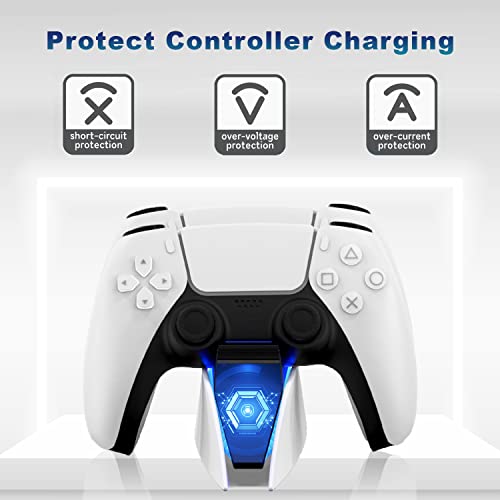 - 【Velocidad de carga rápida】esta base de carga ps5 alimentada con el EU-adaptador de corriente incluido, proporciona la velocidad de carga más rápida en 2 horas. (Aviso: debido al chip protector incorporado, el mando PS5 dejará de cargarse con un volumen de batería del 70%).