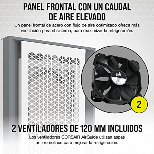 - Dos ventiladores de 120 mm incluidos: Los ventiladores CORSAIR AirGuide utilizan aspas antirremolinos que concentran el flujo de aire y mejoran la refrigeración