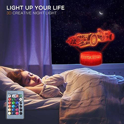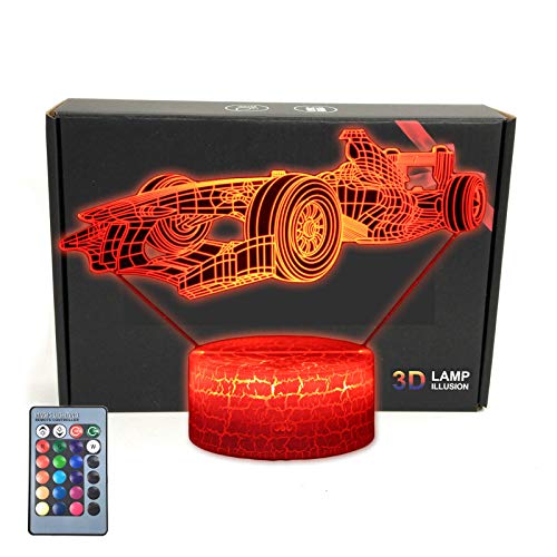 MARZIUS F1 Race Sports Car 3D Illusion Night Light,lámpara de mesa con forma de Roadster con tarjeta de felicitación,base luminosa, para hombres,niños,niños,regalos para adolescentes (1)