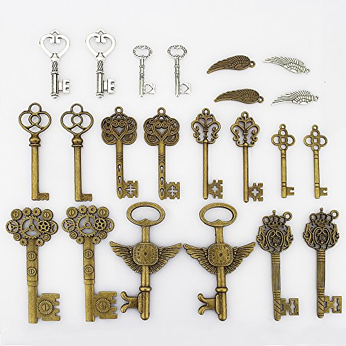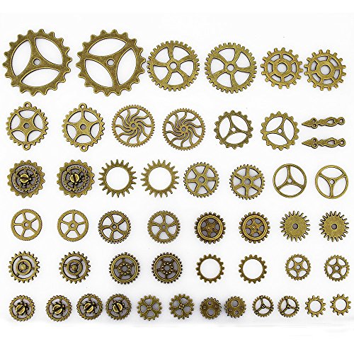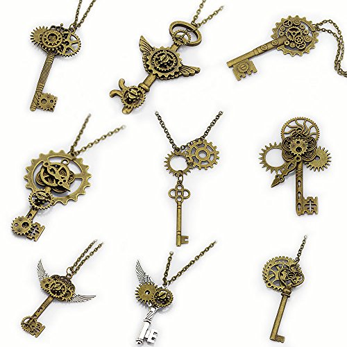 - El kit de bricolaje de collar de estilo steampunk incluye 50 engranajes vintage de bronce steampunk con varios tamaños, 18 llaves de esqueleto con colores mixtos de bronce y plata, 10 alas con colores mezclados, 2 yardas de cadenas de bronce, 200 anillos de salto y 20 cierres de langosta