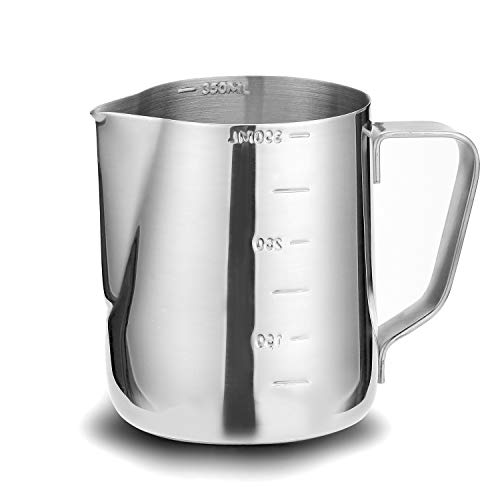 - Jarra de espuma de acero inoxidable Premium: hecha de acero inoxidable de alto grado 304 con una capacidad de 12 oz (350 ml), es Food Safe y no se oxidará ni manchará, es mucho más duradera y resistente que las tazas de plástico o vidrio.