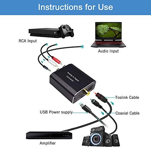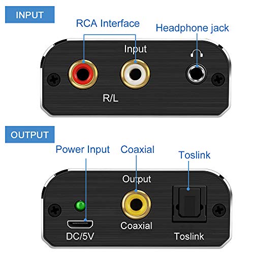- 【Conversor de Audio analógico a Digital】Entrada: RCA (R/L), 3.5 Audio Jack; Salidas: 1 x Toslink (óptico, S/PDIF), 1 x Coaxial; Samplerate: 48 kHz.Admite salida de señal de audio digital LPCM sin comprimir de 2 canales.