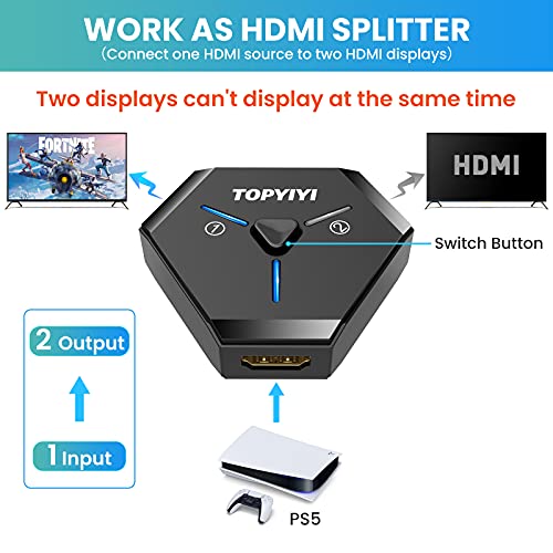 - Switch HDMI Bidireccional: Modo de 2 entradas a 1 salida - intercambia entre dos fuentes de video HDMI (reproductor de DVD, PS4 u otros) a 1 pantalla de HDMI; Modo de 1 entrada a 2 salidas - conecte 1 sola fuente de entrada HDMI para alternar entre 2 pantallas. (?NOTA: no pueden mostrarse en las 2 pantallas al mismo tiempo)