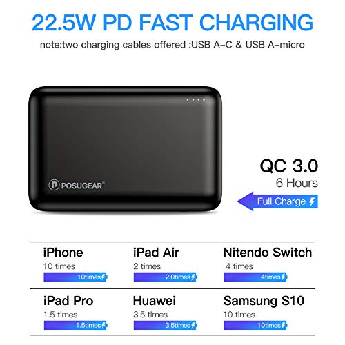 Powerbank 20000mAh, POSUGEAR Bateria Externa Movil Carga Rápida PD 22.5W (USB C Power Delivery & Quick Charge 3.0) con 3 Entradas (Dos Cables - USB C & Micro)